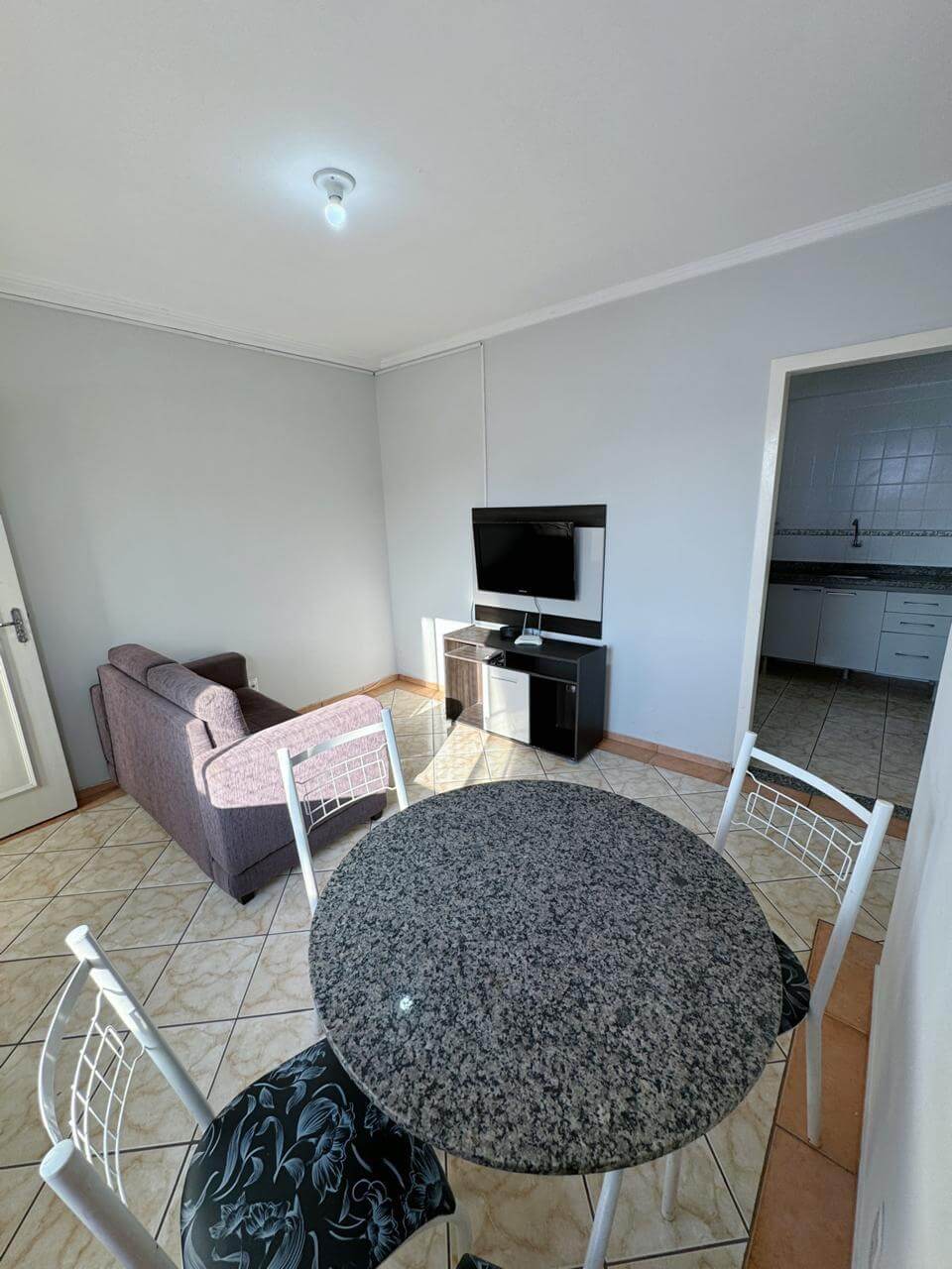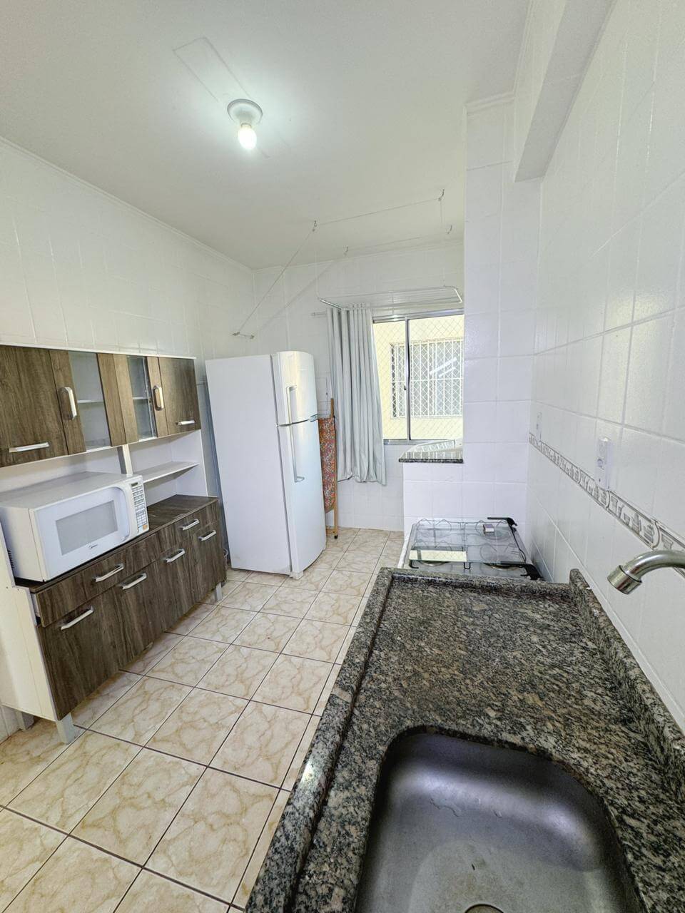 Apartamento completamente mobiliado com suíte funcional, sala integrada, cozinha equipada, lavanderia básica e vaga de garagem.